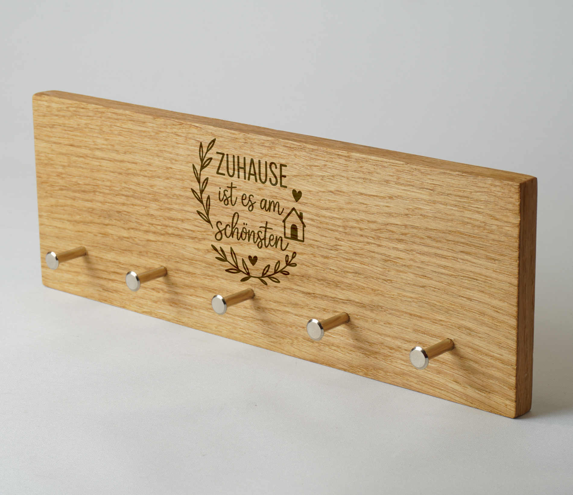 Dieses elegante Schlüsselbrett aus furiertem Eichenholz vereint Funktionalität mit zeitloser Ästhetik. Die hochwertige Gravur "Zu Hause ist es am schönsten" verleiht jedem Eingangsbereich einen persönlichen Touch und erinnert Sie täglich an das Wichtigste. Die robuste Eichenholz-Konstruktion garantiert Langlebigkeit und passt perfekt zu modernen wie klassischen Einrichtungsstilen. Mit praktischen Haken bietet es Platz für mehrere Schlüssel und wird zum stilvollen Ordnungshelfer. Ein durchdachtes Geschenk für alle, die ihr Zuhause lieben.