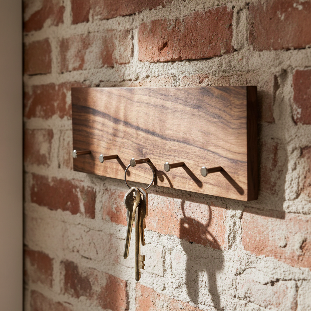 Organisieren Sie Ihre Schlüssel stilvoll mit unserem Schlüsselbrett aus edlem Nussbaum. Das zeitlose Design passt perfekt in jeden Flur oder Wohnbereich und sorgt dafür, dass Ihre Schlüssel immer griffbereit sind. Die warme, natürliche Holzmaserung des Nussbaums verleiht Ihrem Zuhause einen Hauch von Eleganz und Wertigkeit. Robust verarbeitet und langlebig – ein praktisches Accessoire, das Ordnung schafft und gleichzeitig als dekoratives Element besticht.