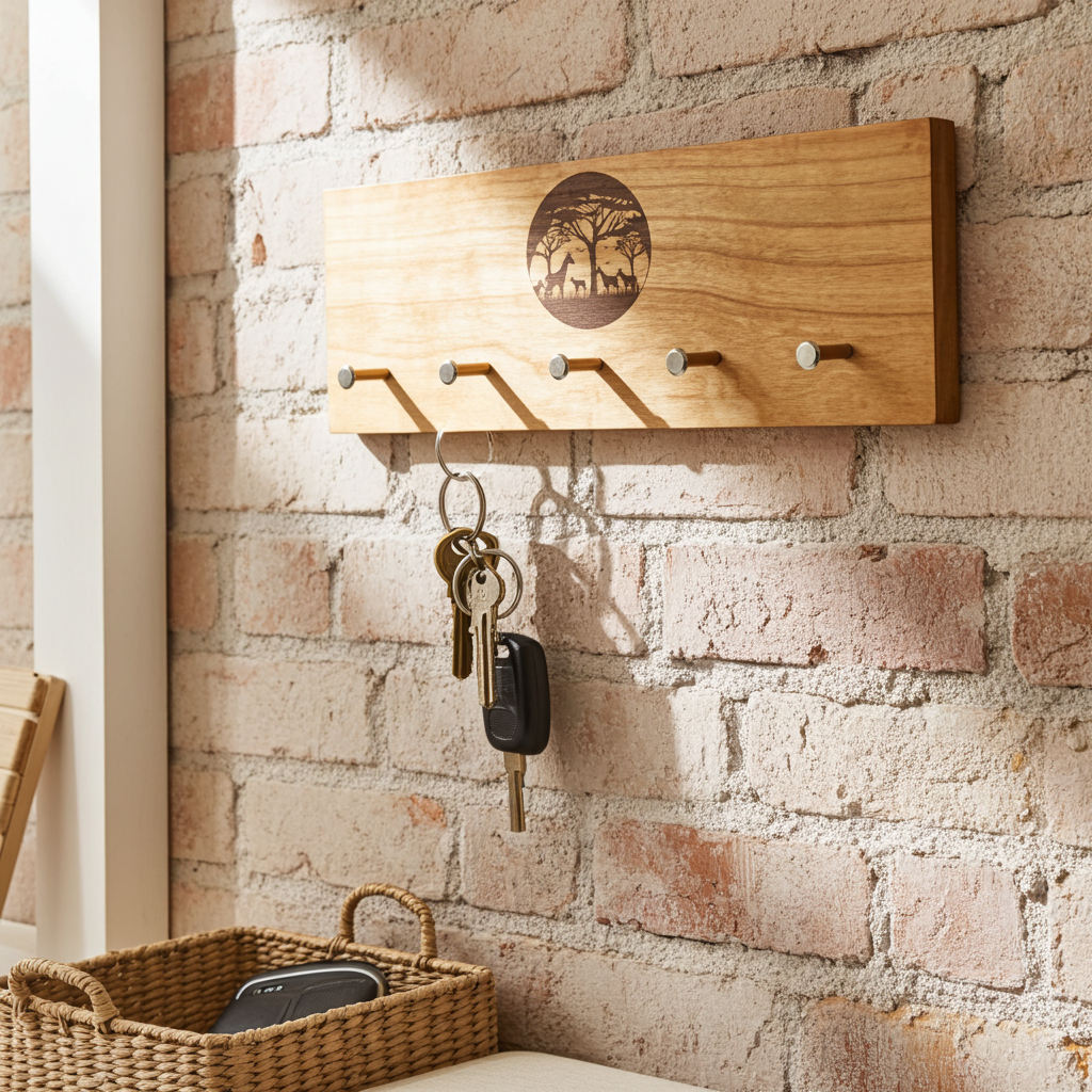 Elegantes Schlüsselbrett mit zeitlosem Afrika-Motiv, das Funktionalität und Ästhetik vereint. Das moderne Design passt perfekt in jeden Eingangsbereich und schafft einen stilvollen Platz für Ihre Schlüssel. Hochwertige Verarbeitung und die harmonische Farbgestaltung machen dieses Accessoire zum dekorativen Blickfang. Ideal für alle, die Ordnung mit Design verbinden möchten.