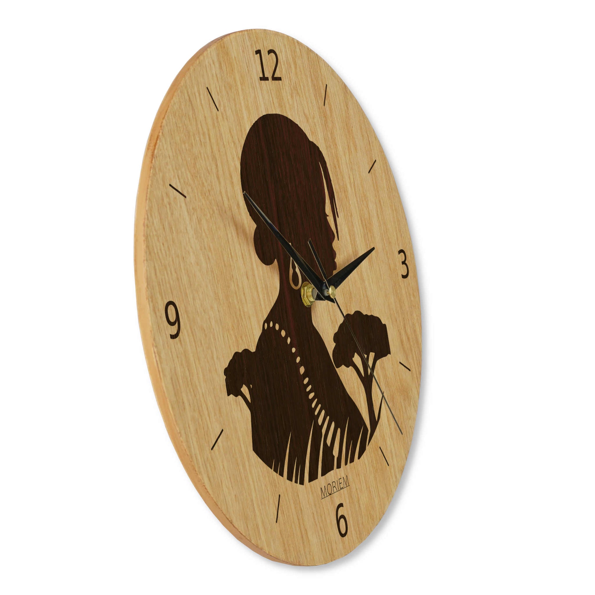Diese verspielte Wanduhr aus Eichenholz zeigt die elegante Silhouette einer afrikanischen Frau und bringt lebendige afrikanische Kultur in Ihr Wohnzimmer. Mit 30 cm Durchmesser ist sie nicht nur ein praktischer Zeitmesser, sondern auch ein charmantes Kunstwerk, das Ihrem Raum Persönlichkeit und Freude verleiht.