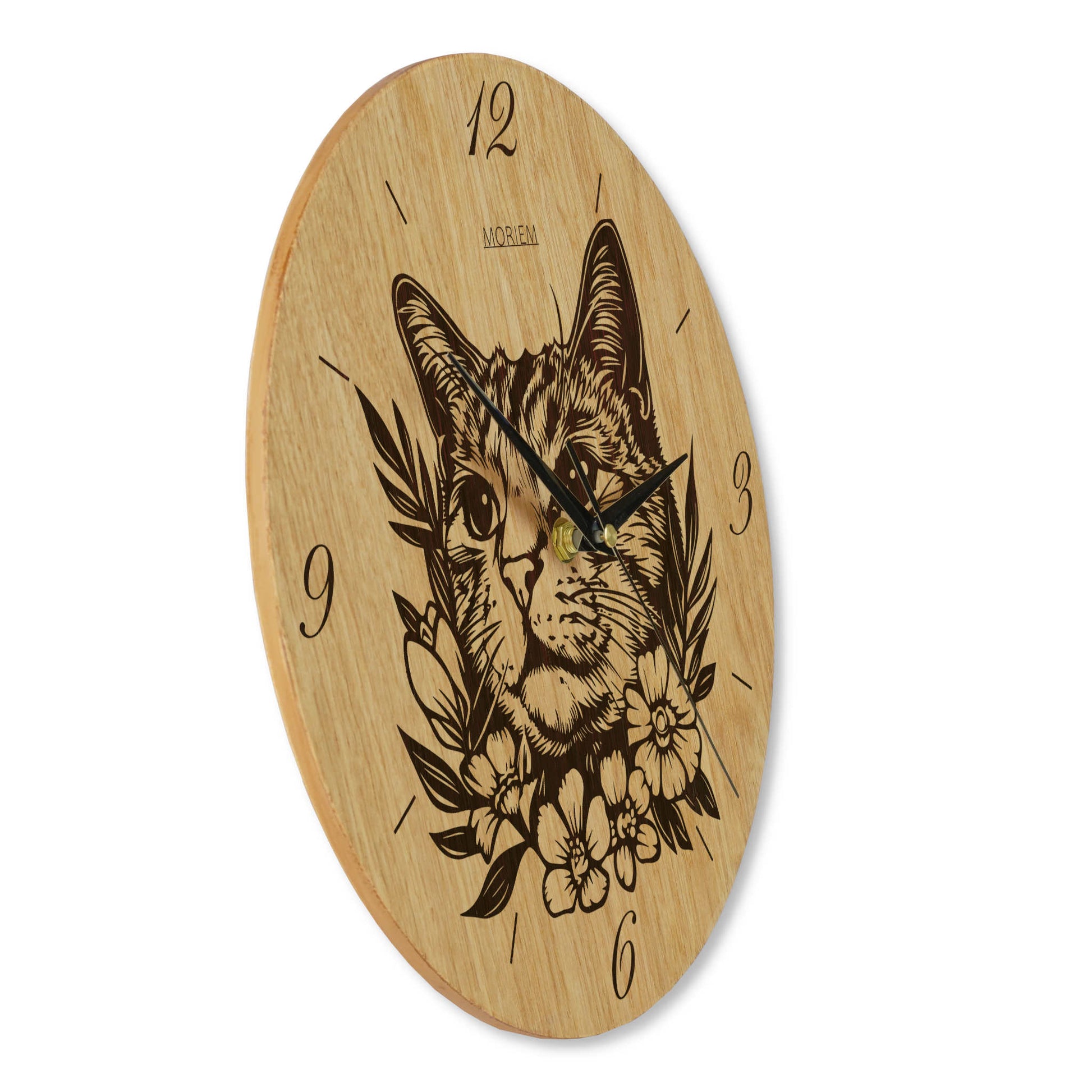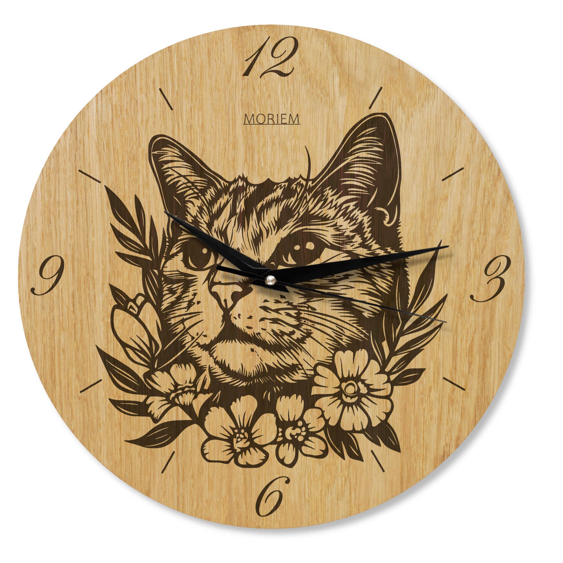 Wanduhr aus Holz - Katze mi Blumen - moderne Wohnzimmeruhr - Eiche 30 cm/40 cm groß
