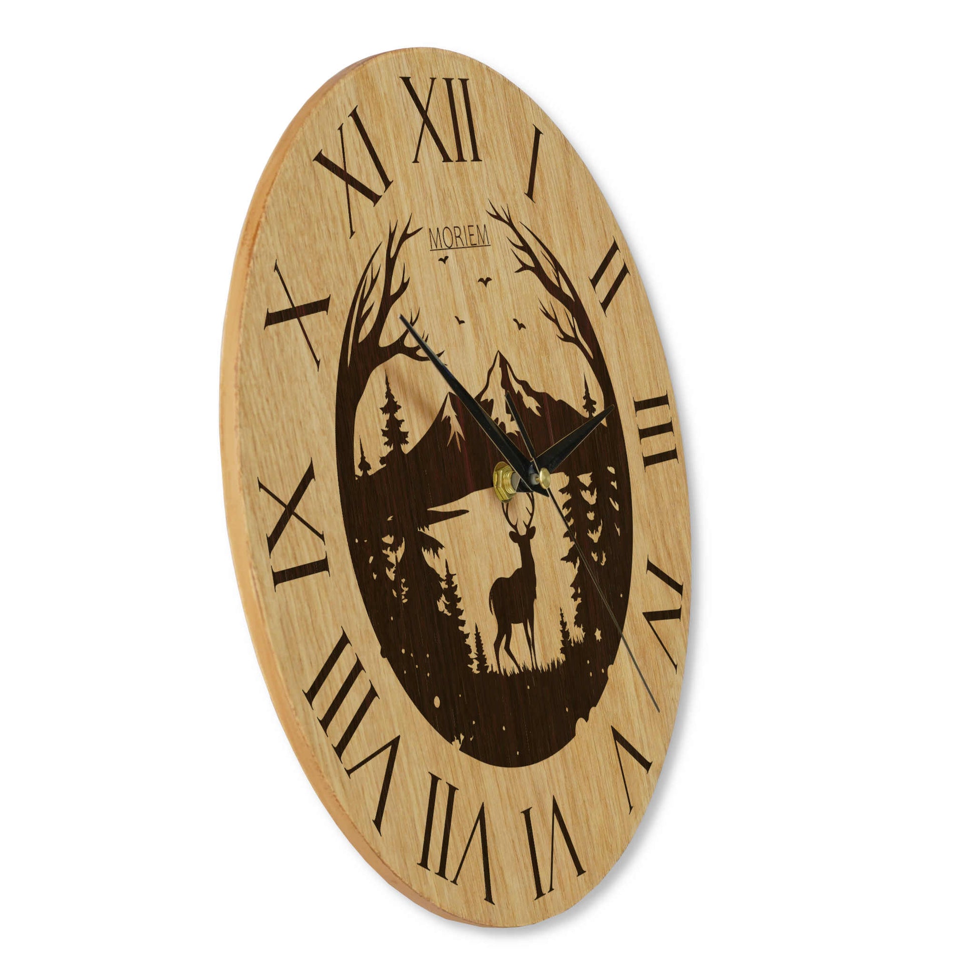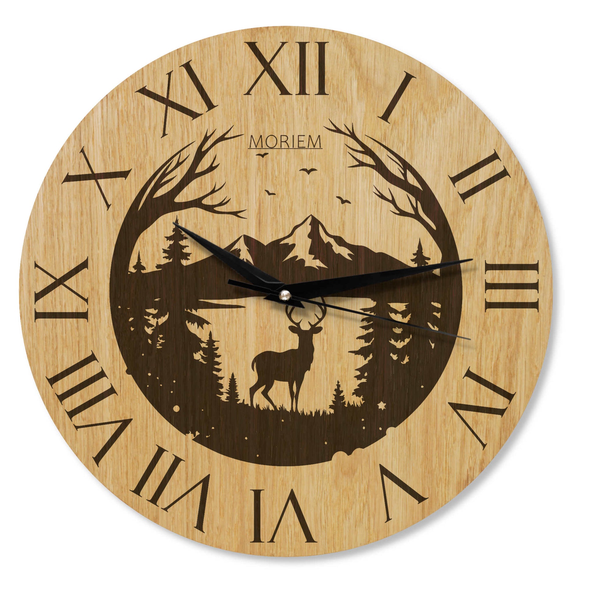 Wanduhr Berge Hirsch Motiv - rustikal - Wohnzimmeruhr Eiche - 30 cm/40 cm groß
