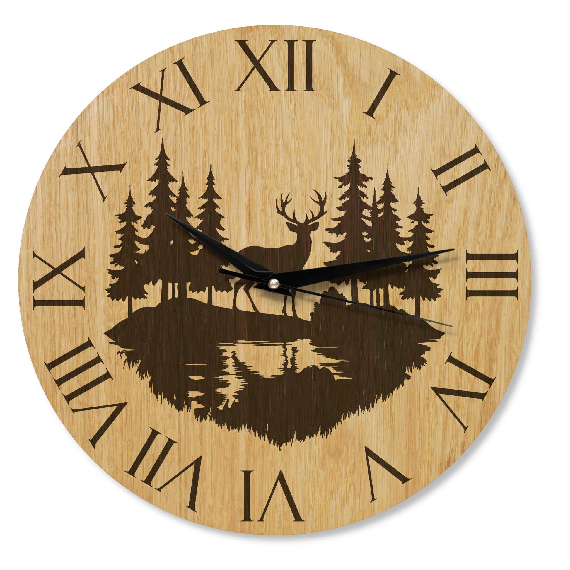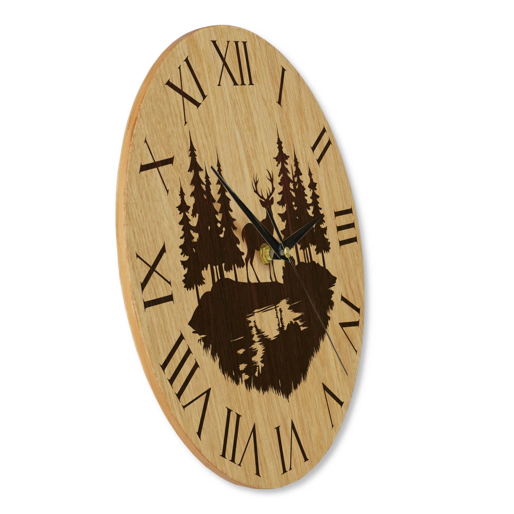 Wanduhr Berge Hirsch Motiv - rustikal - Wohnzimmeruhr - Eiche - 30 cm/40 cm groß