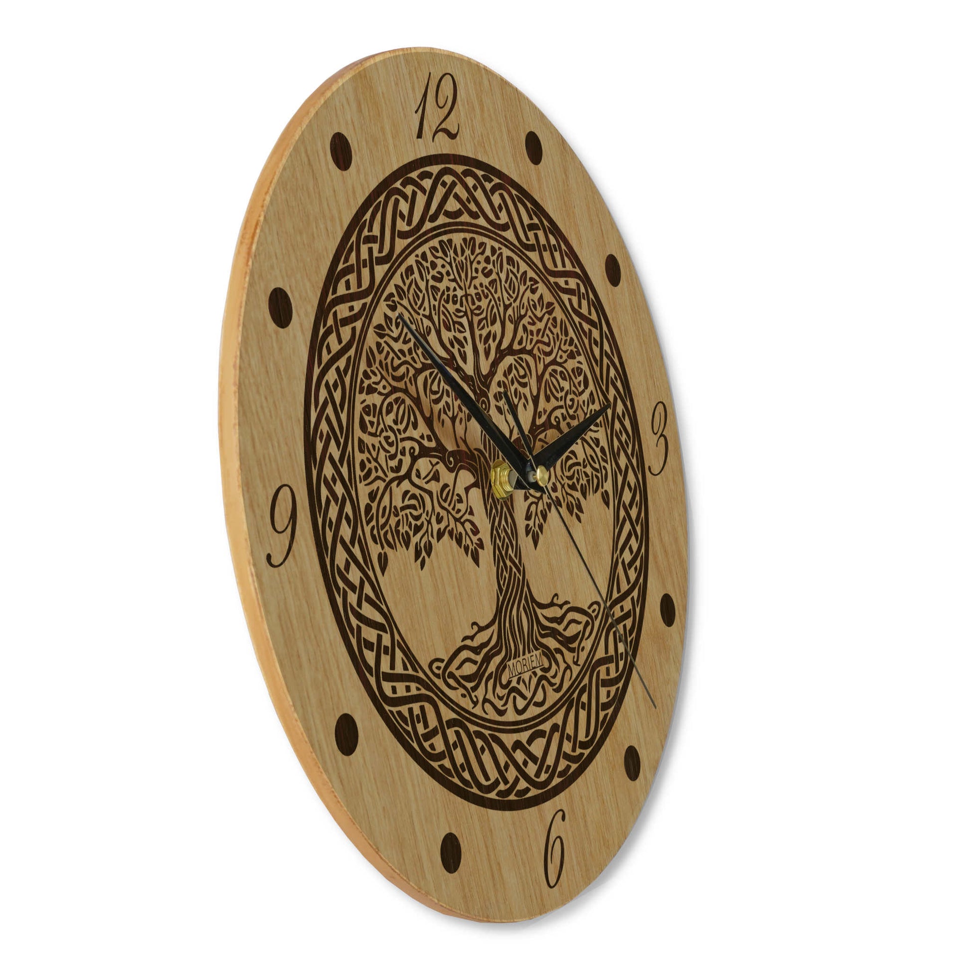 Diese Wanduhr im rustikalen Stil zeigt den keltischen Lebensbaum und vereint klassischen Vintage-Charme mit zeitloser Raffinesse. Mit einem Durchmesser von 30 cm schafft sie eine einladende, symbolträchtige Stimmung in Ihrem Wohnzimmer. Das kunstvoll gestaltete Motiv auf hochwertigem Holz macht diese Uhr zu einem eleganten Highlight, das Tradition und praktische Funktion perfekt kombiniert.