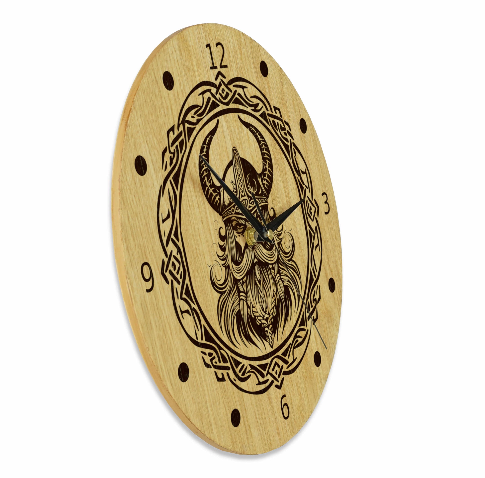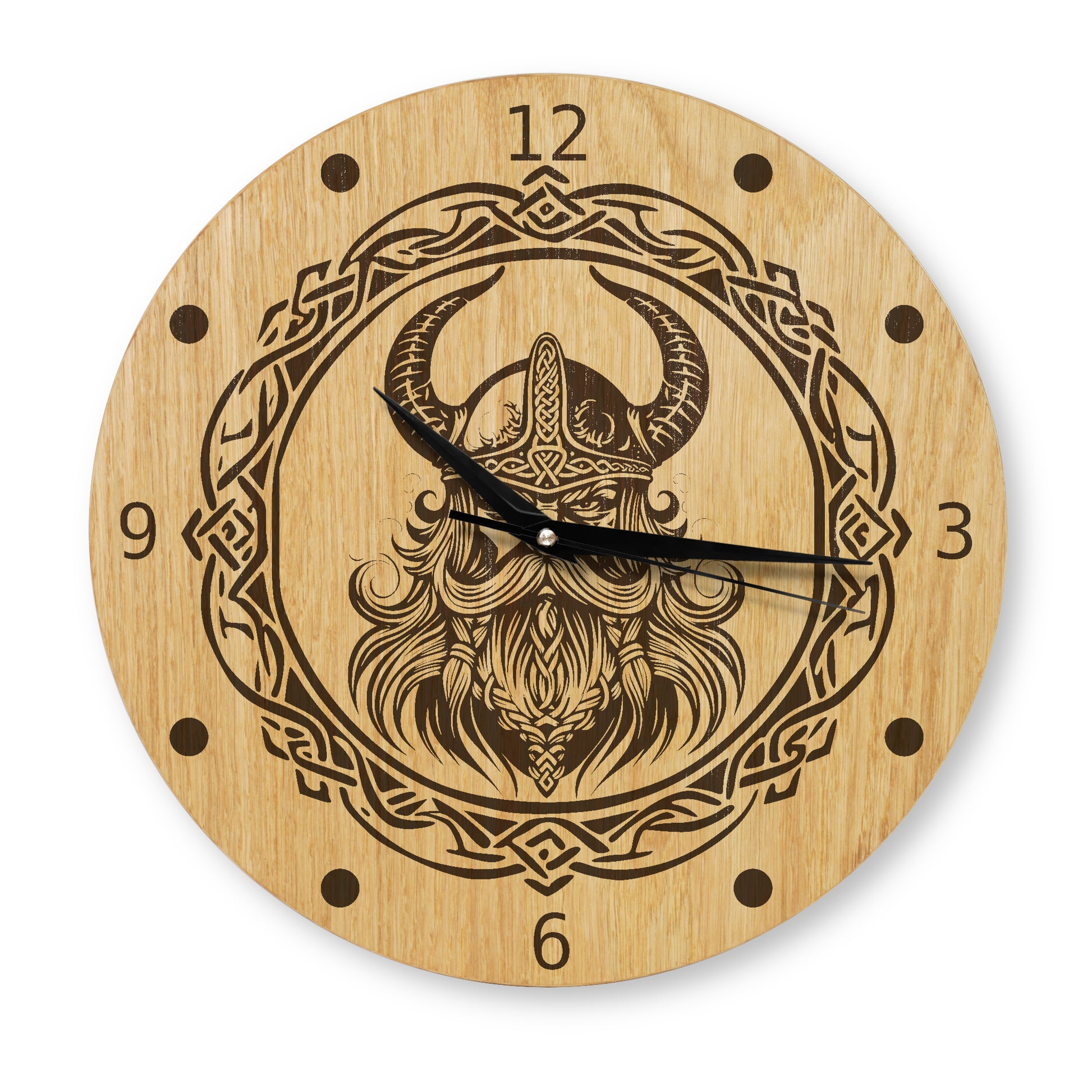 Wikinger Wanduhr Holz - Eiche - Lasergravur Wikingermotiv - 30 cm/40 cm Wohnzimmeruhr